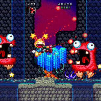 An action-packed platform/shooter with wacky characters, explosive weapons and boss battles to treasure. Sparky is an adorably insane intergalactic bounty hunter who can dash through obstacles, fire his weapons in any direction and even extend his jumps by flapping his long space-rabbit ears. Each time he brings down a boss, his connected confidante Shigg (half shark, half pig) is ready to point him in the direction of yet another space fugitive.